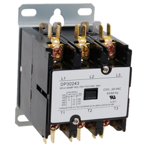 Contactor, 3 pole, 3-3/4" H x 2-3/8"W x 3"D, 1-3/4" screw centers, screw terminals, black, plastic, 24v, 40 amp, UL
