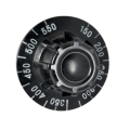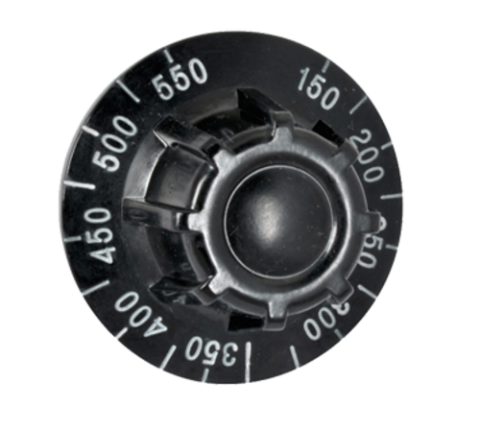 Thermostat Dial, 150° to 550° F temperature range, 2 1/2" OD, black, plastic, flat down