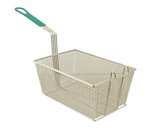 Fry Basket, 13-1/4" x 9-1/4" x 6" H, nickel-plated, front hook, teal vinyl handle, steel