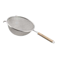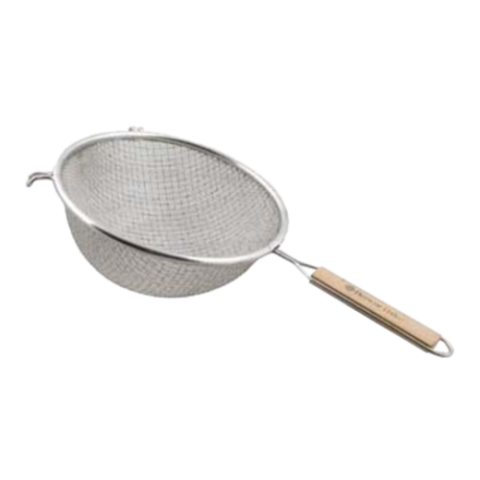 Strainer, 8" dia., #16 mesh on inside, stronger reinforcing mesh on outside, stainless steel with lacquered wood handle