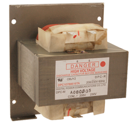 High Voltage Transformer, 6-1/8"L x 5-3/16"W x 3-7/8"D, 1/4" tab terminals, 4-3/4" x 4-5/16" screw centers, green, 208/230v