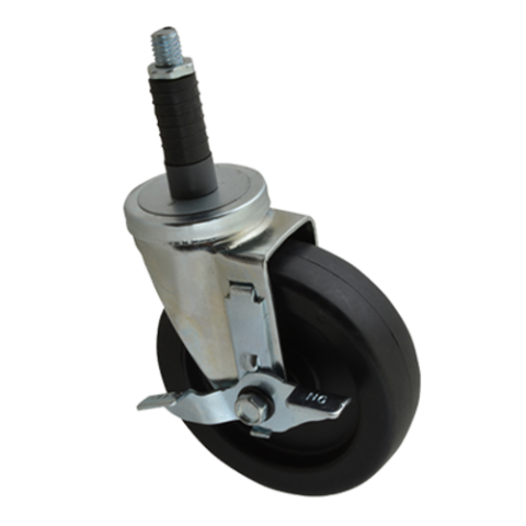 Caster, swivel stem, medium duty, 1-1/4"W, 5" dia., for 1" OD tubing with brake, black rubber wheel with plastic hub