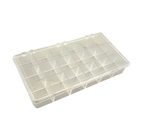 Storage Box, (18) compartments, 8-1/4" x 4-1/2" x 1-3/8" deep, plastic, clear