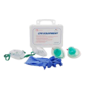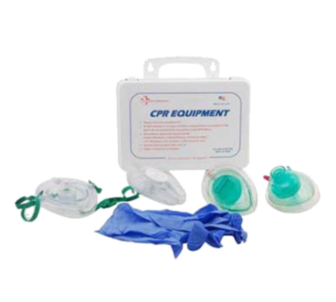 CPR Kit, includes (1) CPR instruction card, (2) adult CPR masks, (2) child CPR masks, (2) pairs of large gloves, (2) pairs of medium gloves, (4) moist towelettes, white plastic case