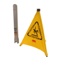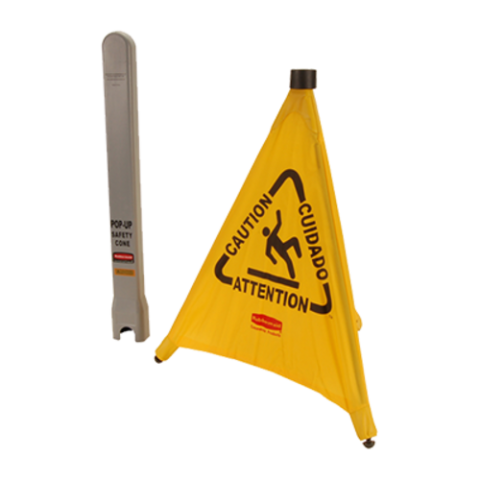 Rubbermaid® Pop-Up Safety Cone, 20"H, triangle with "CAUTION/CUIDADO/ATTENTION" message, yellow with black lettering (includes storage tube for wall mounting)