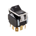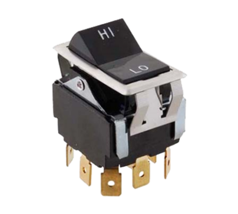 Rocker Switch, hi/lo, 3 pole double throw, 1/4" tab terminals, mounting bezel, encased in rubber boot, black, 125/250v, 10/15 amp, (fits 7/8" x 1-1/2" opening)