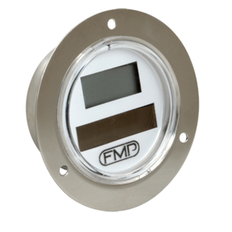 Refrigerator/Freezer Solar Powered Thermometer, digital, type, 3" OD flange, 3/8" high LCD display, fits 2" hole, 5 ft. probe lead, -60° to 160° F temperature range, 10 second update, stainless steel case & flange, recess mounted, NSF