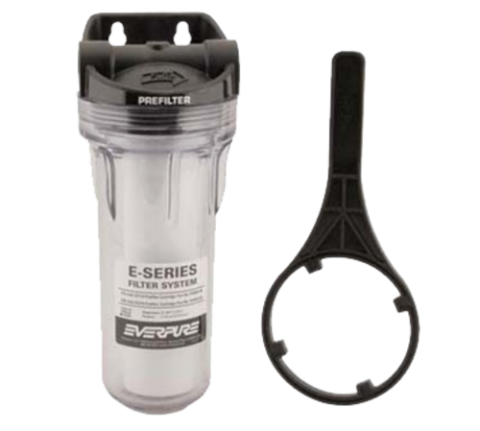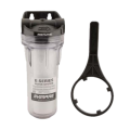 E-Series Prefilter System, 10", with EC110, 4 gpm, 125 psi, includes (1) cartridge head, housing & (2) 3/4" to 1/2" NPT adaptors, 35°F to 100°F temperature range, plastic & polypropylene construction