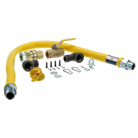Gas Connector Hose, 48", 1" Connection, Stainless steel corrugated tube and braiding, PVC coating, Includes, quick disconnect, gas ball valve, 90° elbows and restraining cable with hardware, Rotational end fitting, Yellow color, Temperature resistant up to 350°F, CSA certified