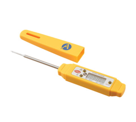 Thermometer, digital, 2-3/4" probe, 5-7/8" overall length, -40° to 392° F (-40° to 200° C) temperature range, 1.5v battery included, antimicrobial sheath, waterproof, dishwasher safe, yellow, plastic, stainless steel probe, NSF