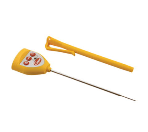 Thermometer, digital, 5" probe, 6-1/2" overall length, -40° to 450° F (-40° to 232° C) temperature range, (2) 1.5v battery included, antimicrobial sheath with clip, waterproof, alarm, dishwasher safe, yellow, plastic, stainless steel probe, NSF