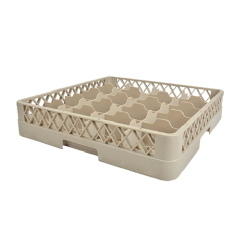 Traex® Full Size Cup Rack, (20) compartment, 3-1/4" x 4-7/8" compartment size, with a 4-7/16" diagonal, 3" inside height, molded in tilt bar prevents water from pooling, leaving spot free ware, open bottom & sidewall, handles on all (4) sides, co-polymer plastic, full size (19-3/4" x 19-3/4"), double wall construction, snap-fit extenders, beige, NSF, Made in USA
