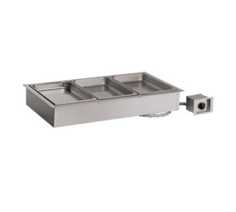Halo Heat® Hot Food Well Unit, Drop-In, Electric, (3) 12" x 20" full-size pan capacity (pans NOT included), 4-3/8" deep well, holds 4" deep pans, includes (6) half/third-size & (2) large pan divider bars, adjustable thermostatic controller, stainless steel construction, EcoSmart®, cULus, UL EPH Classified, CE, IPX3, TUV NORD