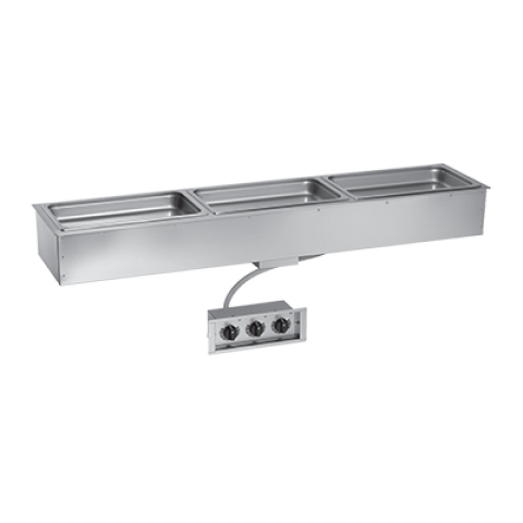 Halo Heat® Hot Food Well Unit, Drop-In, Electric, 65-5/8"W x 14-15/16"D, (3) 12" x 20" full-size pan capacity (pans NOT included), 6-3/8" deep well, holds 6" deep pans, (3) individual adjustable thermostatic controllers, stainless steel construction, EcoSmart®, cULus, UL EPH Classified, CE, IPX3, TUV NORD, EAC