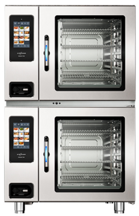 (Quick Ship – STK806137) Prodigi™ Pro Combi Oven/Steamer, gas, boiler-free, double stack, (7) 18" x 26" full size sheet or (16) 12" x 20" full size hotel pan (GN 1/1) capacity per oven, Wi-Fi enabled control with steam/convection/combi cooking modes, programmable cool-down, SafeVent™ steam venting, removable "T" style temperature probe, (3) power levels, (5) cleaning levels, triple-pane doors, (2) side racks with (8) non-tilt support rails per oven, (4) shelves, high efficiency LED lighting, doors hinged right, stainless steel construction, adjustable stainless steel legs, (2) 98,000 BTU, EcoSmart®, cULus, UL EPH Classified, CE, IPX5, EAC, ENERGY STAR®