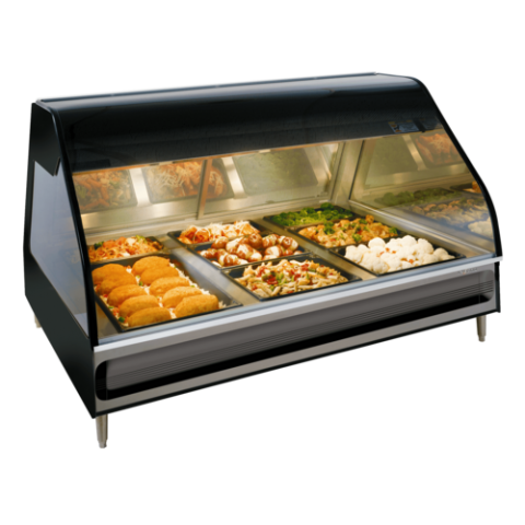Heated Display Case, 48" countertop model, full-service with 3 pan sections, 2 individually controlled top and bottom heat zones featuring Halo Heat® technology and top ceramic heaters, modern overhead LED lighting, self-supporting tempered glass front, removable mirrored sliding doors and glass sides, hinged rear work shelf, 4" legs, pan divider bar package, cULus, UL EPH Classified, CE, IPX3, TUV NORD