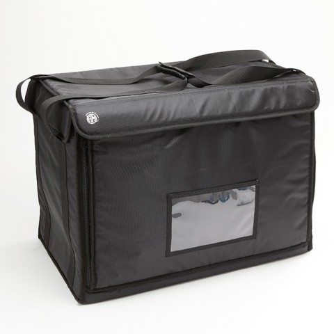 Deluxe Delivery Bag, 22" x 13" x 16", holds 1/1 & 1/2-size food pans, durable, abrasion and mildew resistant polyester with aluminum lined, 5mm of foam for temperature retention, reinforced stitching and iron grommets, with two handed strap, black