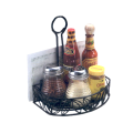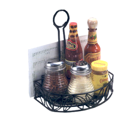 Ironworks™ Condiment Caddy, 8-1/4"L x 6-1/4"W x 9"H, semi round with flat back, clips for menu, center handle with slot for table number (not included), leaf design, black wrought iron (hand wash only)