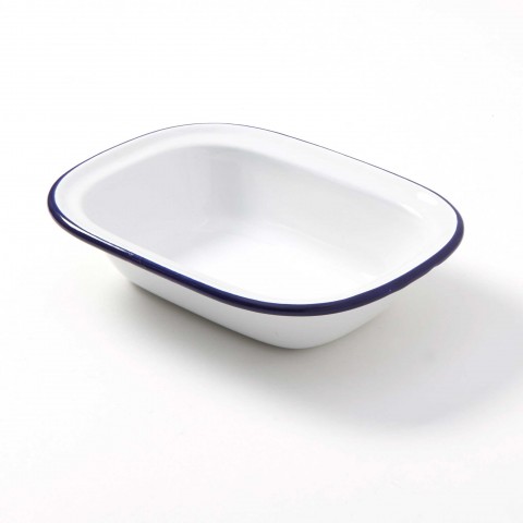 Enamelware Bowl, 16 oz., 7-7/8"L x 5-7/8"W x 1-1/2"H, oblong, enamel coated steel, white with blue rim (hand wash only)
