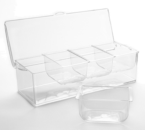 Condiment Server Set, 88 oz. (2.6L), 16"L x 6-1/4"W x 5-1/4"H, includes (4) removable compartments (22 oz. per compartment), with ice space and hinged lid, polycarbonate, clear (hand wash only)