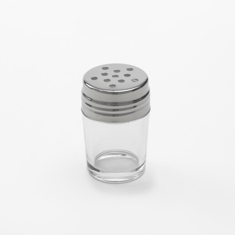 Cheese Shaker, 2 oz., 2" dia. x 3-1/8"H, stainless steel perforated top, glass, clear