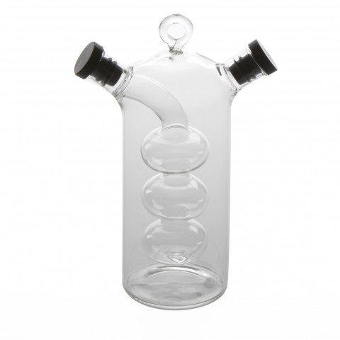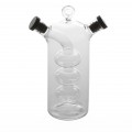 Oil & Vinegar Cruet, dual chamber: 2 oz. inner capacity, 10-1/2 oz. outer capacity, 2-1/2" dia. x 7"H, with black silicone lids, hand-blown, glass, clear (hand wash only)