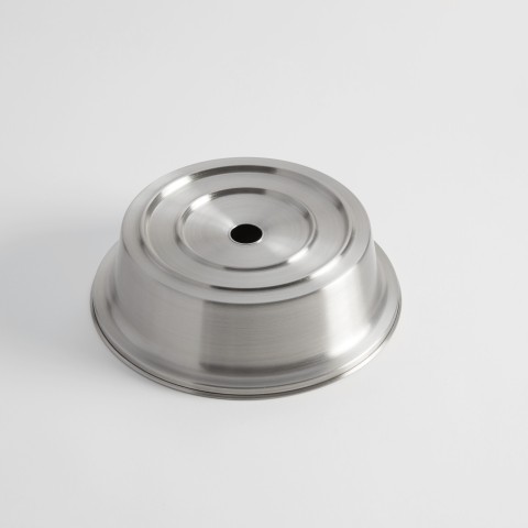 Plate cover, fits plates 8-1/16" to 8-1/4" dia., with stand or wide foot, includes finger hole, round, stainless steel