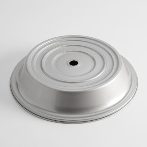 Plate cover, fits plates 12-3/16" to 12-9/16" dia., with stand, narrow or wide foot, includes finger hole, round, stainless steel