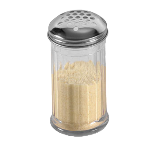 Cheese Shaker, 12 oz., 3" dia. x 5-3/8"H, 1/4" extra large holes, straight fluted, stain proof, stainless steel perforated top, SAN-plastic, clear