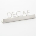 Sign, "decaf", 5"L x 3/4"W x 1-1/2"H, stainless steel