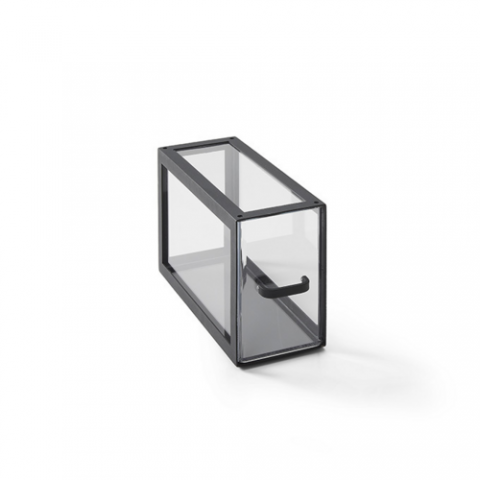 Black Twilight Modular Display Case, quarter size, 13-3/4" W x 7-7/8" H, clear acrylic drawers, matte black metal frame, stacking pins, top openings for stacking, countertop use