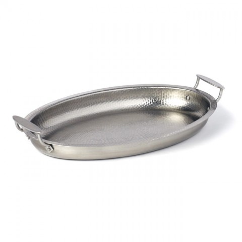 Serving Pan, 128 oz., 18-1/4"L x 12-3/8"W x 2"H, oval, 20"L with handles, stainless steel, hammered finish