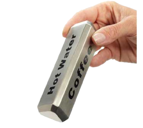 Beverage Sign, 4-3/4"L x 1-1/2"W x 1-3/8"H, triangular, 3-sided identifies: Coffee, Decaf, Hot Water, stainless steel, smooth satin finish