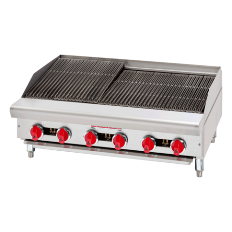 Charbroiler, gas, countertop, 36" wide, (6) burners, 4" adjustable legs, heavy duty reversible cast iron grates, 21"cooking depth, manual controls, removable radiants & full width grease pan, stainless steel front & sides, 90,000 BTU, ETL, Made in USA