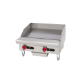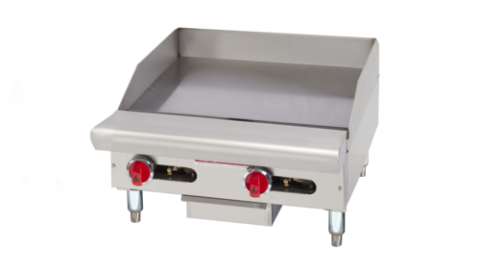 Griddle, gas, 24" wide, countertop, 1" thick smooth polished steel griddle plate, 21"cooking depth (2) "U" shaped burners, modulating thermostate with standing pilots, 3" splash guard, 4" adjustable legs, stainless steel grease trough & grease drawer, stainless steel exterior, 60,000 BTU, ETL, Made in USA