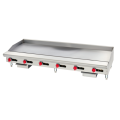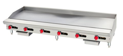 Griddle, gas, 72" wide, countertop, 1" thick smooth polished steel griddle plate, 21"cooking depth (6) "U" shaped burners, modulating thermostate with standing pilot, 3" splash guard, 4" adjustable legs, stainless steel grease trough & grease drawer, stainless steel exterior, 180,000 BTU, ETL, Made in USA