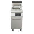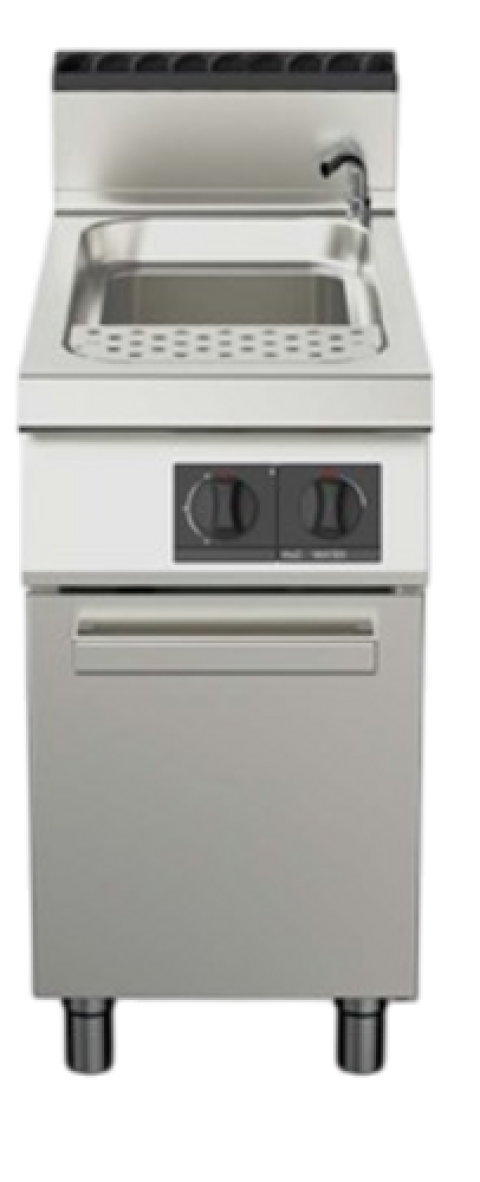 AMPTO® Pasta Cooker; Electric model; (1) 12-gallon tank with dual power element, variable power settings including low/simmer; heavily insulated stamped tanks in 316 stainless steel with rounded corners; 304 stainless steel structure; automatic starch removal system; refreshing point, open space basin for easy cleaning, tank bottom false removable, fresh water faucet, front access; accommodates multiple pasta basket configurations, (6) 1/6 baskets per tank included; adjustable legs, removable cast iron chimney, pressure switch safety shut -off; 9kW max power, 220v/50-60Hz/3-ph, cETL, ETL, NSF, Made in Italy