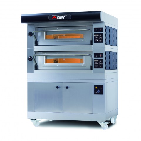 Moretti Forni Pizza Oven, deck-type, electric, (2) 38"W x 41"D x 7"H decks, (18) 12" or (8) 18" pizza capacity, (20) customizable programs (per deck), 840°F max operating temperature, timer, (2) stainless steel bottom-hinged doors, halogen lighting, refractory brick baking chamber (entire camera), stainless steel construction, 21.0kW, CE, ETL, ETL-Sanitation, Made in Italy (MPN AMA0C02S)
