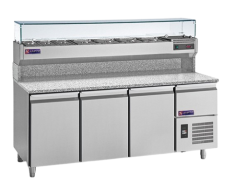 AMPTO® Granite Pizza Prep Table, Refrigerated, three-section refrigerated and one-section neutral over compressor, 16.0 cu. ft. capacity, (3) self-closing doors, (1) Stainless steel wire shelve per section with universal stainless steel tray slides included, digital controller, 30" deep Sardinian Granite Work Surface with rear risers 6-1/3” H, top refrigerated ingredient display case included, side mounted, slide-out self-contained refrigeration, (G/N pans included: (2) ½ GN, (4) 1/3 GN, (4) 1/6 GN, (3) 1/9 GN) 300 series stainless steel exterior & interior, prep table: R290 refrigerant, 110V/60hz, cETLus, ETL-Sanitation