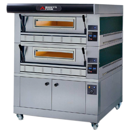 Moretti Forni Pizza Oven, natural gas, deck-type, (2) 44"W x 29"D x 7"H decks, (14) 12" or (4) 18" pizza capacity, 840°F max operating temperature,(2) stainless steel bottom-hinged doors, halogen lighting, double-layer refractory brick baking surface, stainless steel external structure, 220,000BTU, 110v/60/1-ph, 43.0kW, CE, ETL, ETL-Sanitation, Made in Italy (MPN P110A02S)