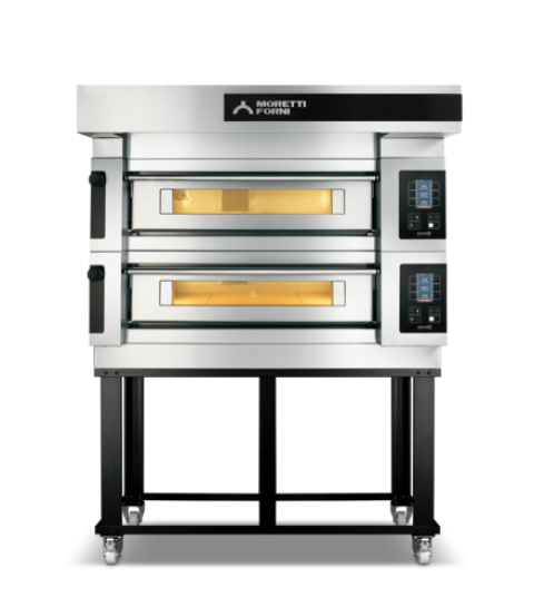 Serie S Moretti Forni Pizza Oven, electric, deck-type, (2) 37-1/2"W x 29"D x 6-1/4"H decks, (4) 14", (2) 18" pizza or (2) tray 26"x18" capacity per deck, refractory brick baking surface, (100) customizable programs (per deck), 842°F max operating temperature, timer, (2) stainless steel bottom-hinged double doors, halogen lighting, stainless steel external structure, Standard open frame base with caster is included, 9kW/deck, CE, ETL, ETL-Sanitation, Made in Italy (MPN S1002S03)