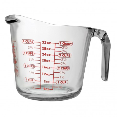 Measuring Cup, 32 oz., 5-3/4" dia. x 5-3/4"H, open handle, red markings, fully tempered glass, clear (3 each per case)
