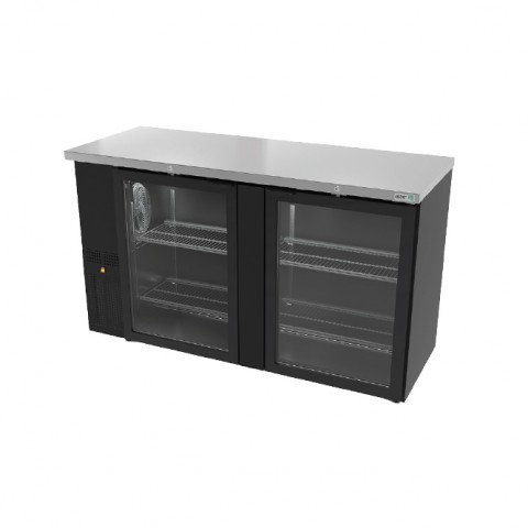 (19102366) Slim Line Back Bar Cooler, 49-5/8"W x 24-3/8"D x 35-1/2"H, self-contained refrigeration, two-section, (2) glass doors, (300) 12 oz can/ (2) keg capacity, (4) adjustable coated wire shelves, adjustable bottle rails, electronic controller, fluorescent interior light, Ecomate® polyurethane insulation, temperature from 33° to 38°, front breathing/ left side mount compressor, magnetic door gasket, stainless steel top, black vinyl exterior, galvanized interior, R-290 hydrocarbon refrigerant, 1/3 HP, cETLus, ETL-Sanitation, Made in North America