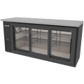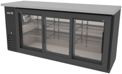 (19113587) Slim Line Back Bar Refrigerator, black vinyl exterior, glass sliding doors, 72-1/4"W x 24-7/8"D x 34-3/8"H, (3) doors, (6) shelves, 18.3 cu. ft. capacity, holds 540 12 oz bottles, 115V/50-60Hz, 1/3 HP, 3.0A, R290 hydrocarbon refrigerant, fully front-breathing side-mounted refrigeration, electronic controller with digital display, temperature range 32°F to 38°F, ambient up to 100°F/65% RH, full stainless-steel interior, energy-efficient LED lighting, hermetic compressor, epoxy-coated evaporator, magnetic one-piece door gaskets, adjustable bottle rails, NSF-7, ETL, DOE compliant, Made in North America