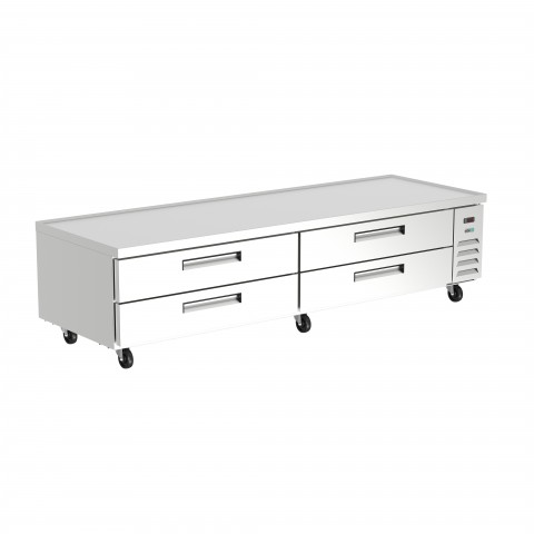(19086809) Chef Base Refrigerated Equipment Stand, 96-5/8" W, side-mounted self-contained refrigeration, electronic control, temperature range 32° F to 41°F, (4) drawers, (3) 12" x 20" pan capacity per drawer, (pans sold separately), marine edge top, stainless steel construction, 5" casters (2 with brakes), R-290 hydrocarbon refrigerant, 1/4 HP, cETLus, ETL Sanitation
