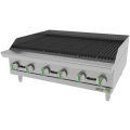 Emerald Line Countertop Gas Radiant Broiler, 36"W x 32"D x 16-1/4"H, (6) flute-type stainless-steel burners, 20,000 BTU/hr per burner (120,000 BTU total), reversible heavy-duty cast iron grates, cast iron radiants, 24" deep cooking area, 4" high 14-gauge perimeter splash guard, integrated grease collection channels, manual ignition with stainless-steel standing pilot lights, Zamak flame control knobs, standard gas regulator, gas conversion kit (NG/LPG), adjustable stainless-steel legs (4–6"), 4" landing ledge, 4" deep grease channel, 1" stainless-steel grease tray, 3/4" gas connection, gas pressure 5” W.C. (NG) / 10” W.C. (LPG), convertible to lava rock,NSF Certified, UL Listed, Made in North America