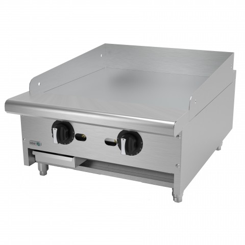 Griddle, gas, countertop, 24"W x 33-3/4"D x 16-1/4"H, (2) 24,000 BTU burners, 3/4" thick polished steel griddle plate, thermostatic controls, 4" grease trough, 14 gauge stainless steel splash guard, pressure regulator, stainless steel front, sides & ledge, adjustable feet, 48,000 BTU, ETL-Sanitation, cETLus, CSA, Made in North America