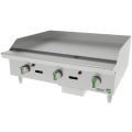 Emerald Line Countertop Gas Thermostatic Griddle, 36"W x 33-1/8"D x 16-1/4"H, (3) U-type stainless-steel burners, 30,000 BTU/hr per burner (90,000 BTU total), 1" thick cold-rolled fully-welded plate, thermostatic controls for every two burners, temperature range 200°F–550°F, 24" deep cooking area, 4" high 14-gauge perimeter splash guard, heavy-duty stainless steel front, sides, and landing ledge, fully insulated panels, 14-gauge stainless-steel U-frame, piezo ignition, Zamak flame control knobs, standard gas regulator, gas conversion kit (NG/LPG), adjustable stainless-steel legs (4–6"), 4" landing ledge, 4" deep grease channel, 2-gallon stainless-steel grease tray with drip indicator, 3/4" gas connection, gas pressure 5” W.C. (NG) / 10” W.C. (LPG),NSF Certified, UL Listed, Made in North America