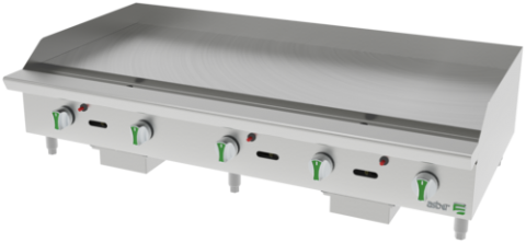 Emerald Line Countertop Gas Thermostatic Griddle, 60"W x 33-1/8"D x 16-1/4"H, (5) U-type stainless-steel burners, 30,000 BTU/hr per burner (150,000 BTU total), 1" thick cold-rolled fully-welded plate, thermostatic controls for every two burners, temperature range 200°F–550°F, 24" deep cooking area, 4" high 14-gauge perimeter splash guard, heavy-duty stainless steel front, sides, and landing ledge, fully insulated panels, 14-gauge stainless-steel U-frame, piezo ignition, Zamak flame control knobs, standard gas regulator, gas conversion kit (NG/LPG), adjustable stainless-steel legs (4–6"), 4" landing ledge, 4" deep grease channel, 2-gallon stainless-steel grease tray with drip indicator, 3/4" gas connection, gas pressure 5” W.C. (NG) / 10” W.C. (LPG),NSF Certified, UL Listed, Made in North America