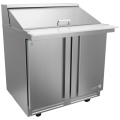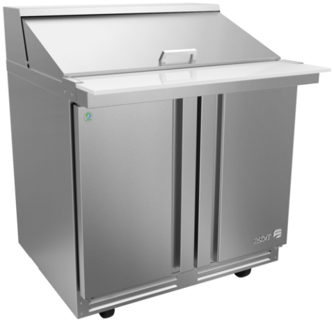 Premium Mega-Top Prep Table, 36-3/8"W x 36-1/8"D x 44-5/8"H, (2) doors, (2) shelves, 13.1 cu. ft. capacity, 15 pans, 115V/60Hz, 1/10 HP, 1.5A, R290 hydrocarbon refrigerant, electronic controller, temperature range 32°F to 41°F, ambient up to 100°F/65% RH, Ecomate™ insulation, exclusive high-capacity base design, full stainless-steel exterior & interior, insulated lid, unique bottom air panel, supplied with 1/6-size pans (4" deep), full-length removable 10" white Nylamid cutting board, magnetic one-piece door gaskets, 5" casters (front with brakes), NSF-7, ETL, DOE compliant, Made in North America.